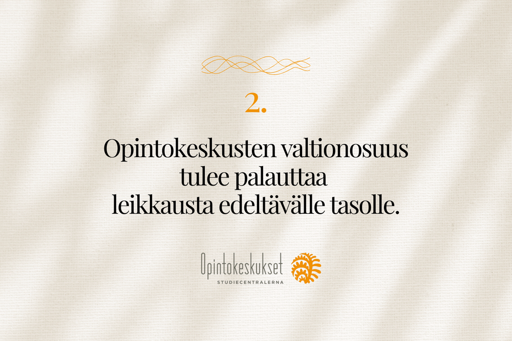 2. Opintokeskusten valtionosuus tulee palauttaa leikkausta edeltävälle tasolle.